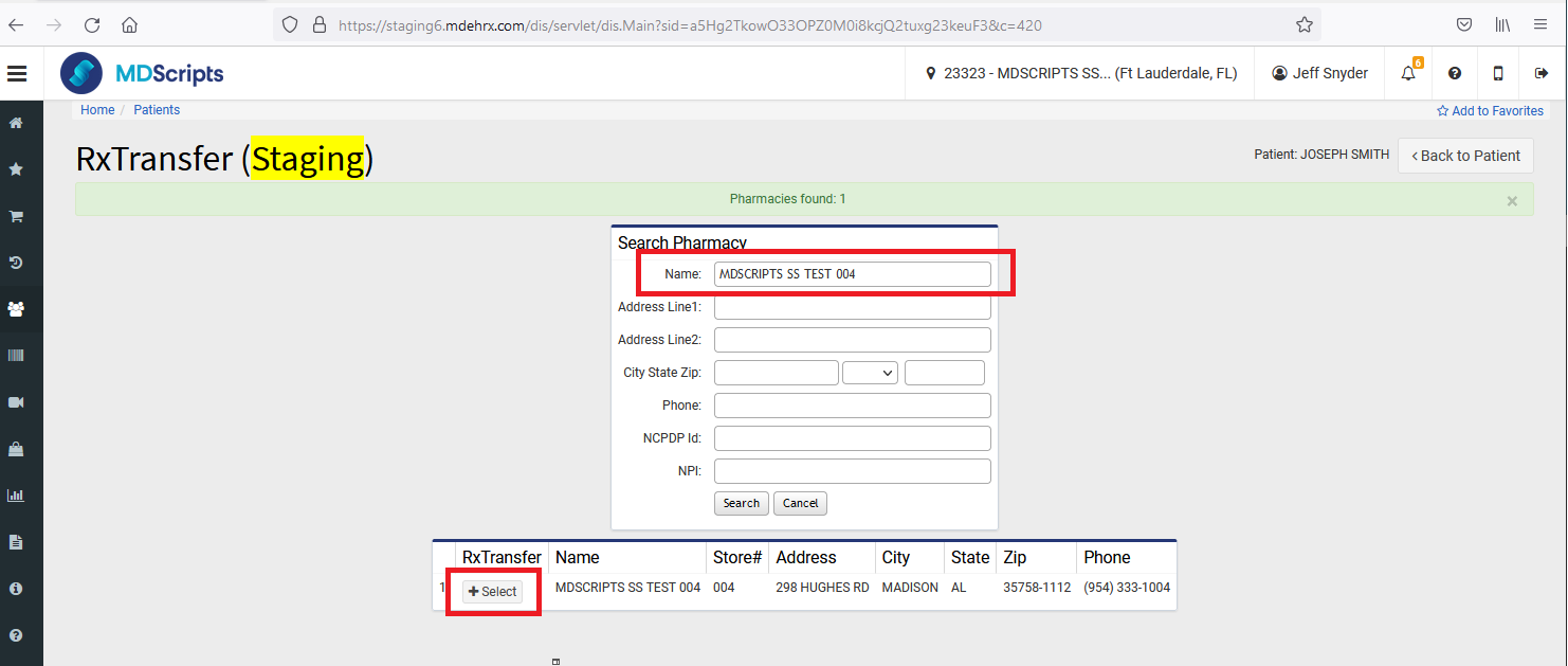 Search for Receiving Pharmacy by typing Name, address, NCPDP, or NPI and then click on " Select" from search results.