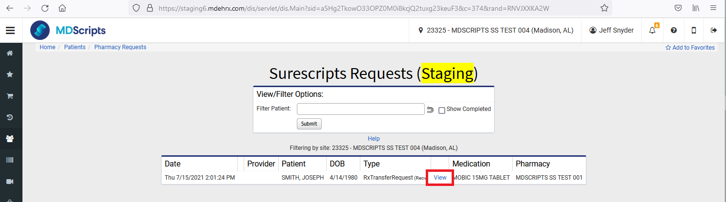 From the Surescripts Requests screen, select "View" on the transferred script.