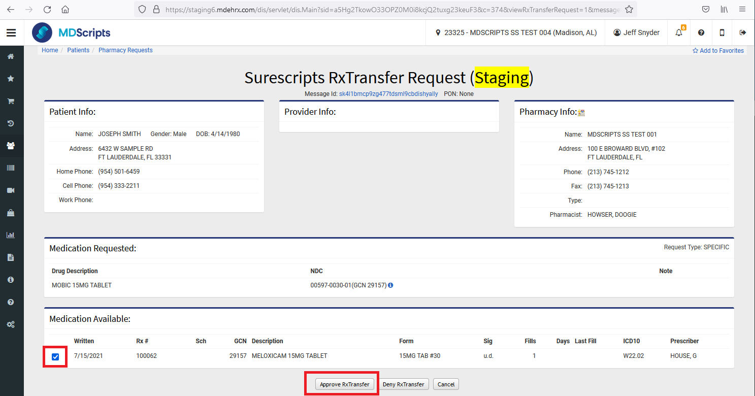 Select the Prescriptions that should be approved and then click on the "Approve RxTransfer" button. If the transfer is not approved, select the "Deny RxTransfer" button